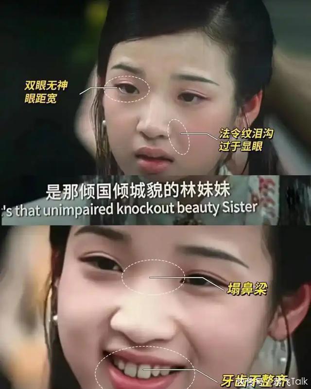 我就不信,看到这口牙,有人把她和林黛玉联系在一起,她这口牙长得实在是太张狂了吧? 而且,她的眼睛也很小,甚至还有点三角眼的感觉,鼻子也不是那么的高挑,这个五官单拎出来,都算不上是优秀,但是组合在一起,就更加的普通了。